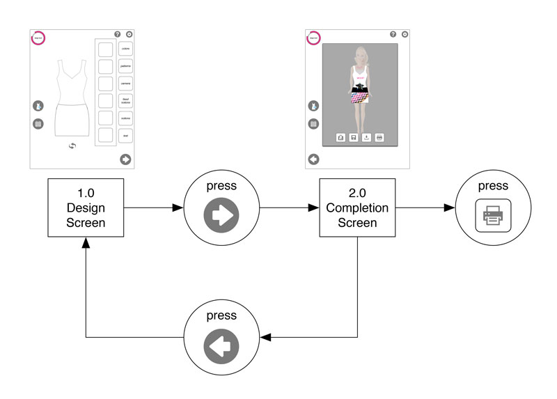 - We tested whether users understood how get to the print screen from the design screen without an obvious print icon. Testing showed that children understood that the right arrow in the bottom righthand corner would take them to the âpreviewâ screen where they would then be able to print their designs if they want to.