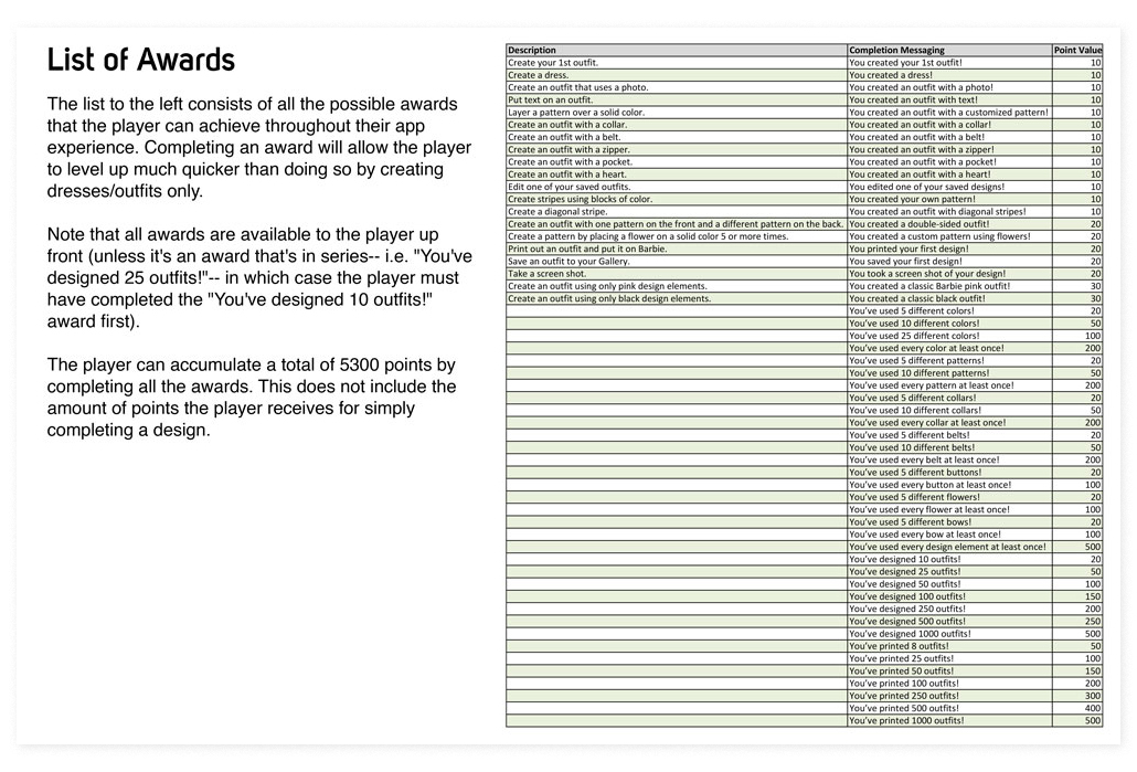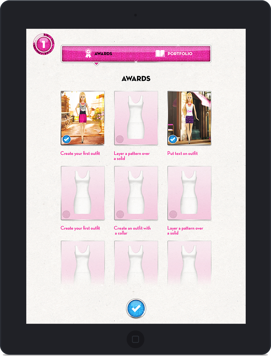 Using the âfashion designerâ concept that Mattel provided, we defined a narrative in which users progress through their career as Barbieâs fashion designer; starting out first as a student before officially starting their career at level 1 once theyâve completed their first design. This story was structured accomplishments and achievements that were unlocked by completing a multitude of tasks and performing specific actions-- ultimately encouraging users to explore the entire offerings of the app while feeling a sense of progress and advancement in the storyline. I created a point and scoring system that was implemented to track the userâs game progress, which also factored in the aforementioned milestones.