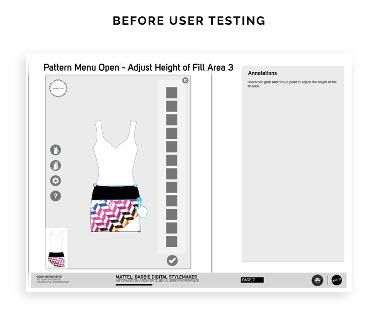 The primary goal of designing an app for which users could design and print outfits for their Barbie dolls was clear. But in speaking to key stakeholders to uncover potentially hidden goals, we discovered that the secondary goal of the app was two-fold: bolster the replay value of the app, and encourage users to design more outfits to drive additional sale of the proprietary fabric paper. My team and I regrouped, and given these goals, we brainstormed ways to address them and defined several problems that, when answered, would help us achieve them.