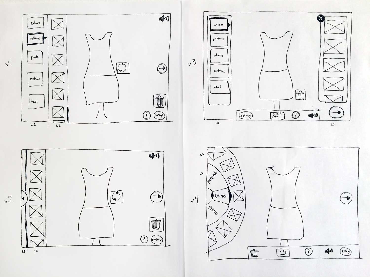 We carried over the drag-and-drop concept from the prototype we had designed for Mattel to focus test the idea. Before we committed ourselves to refining our first solution, we sketched out and explored various menu styles that organize the multitude of design elements. Together we discussed the merits of each direction we came up with, weighing the pros and cons of each as a way to narrow down the selection.