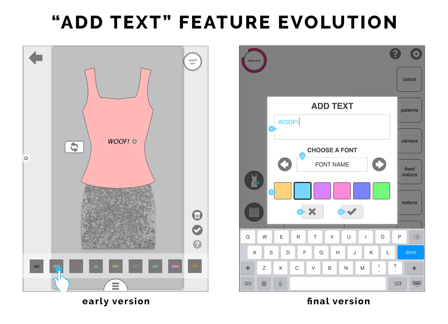 While this was the more simple approach, we had to remind ourselves that customizability is critical to user engagement, so I revisited the feature. The solution was a singular interface for creating text; fonts and colors were now separate options.