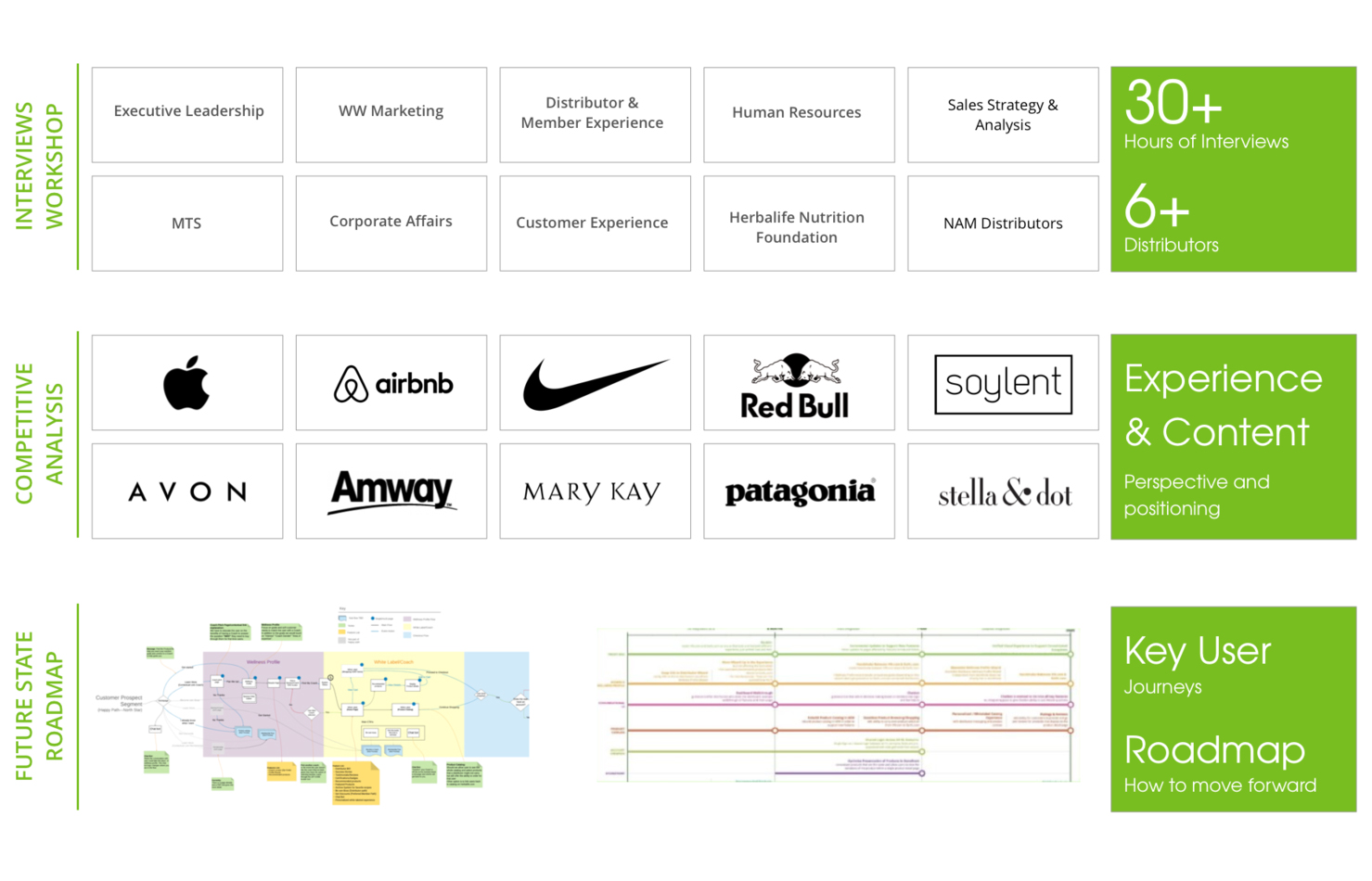 The work my team and I did resulted in a rough roadmap for which Herbalife could follow that took into consideration in-flight initiatives and existing infrastructure. We organized our findings and presented it to the executive stakeholders.
