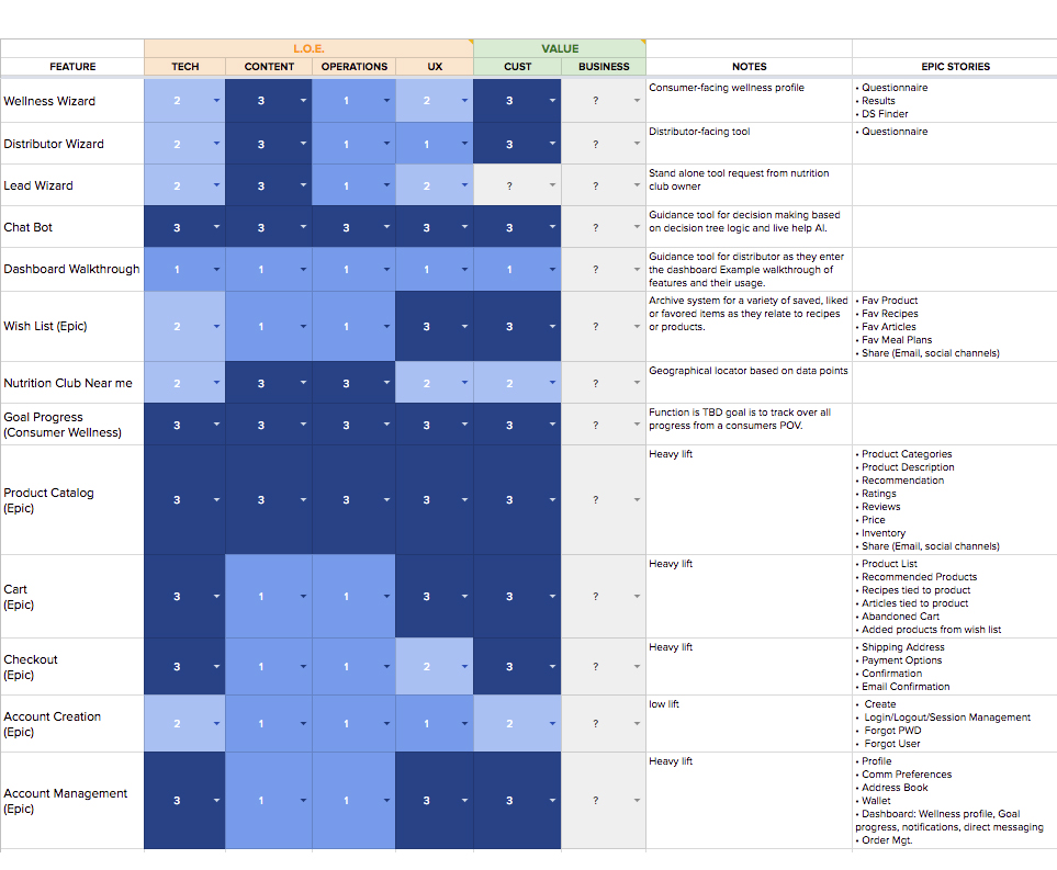 The workshop yielded a working matrix of the level of efforts for our solutions. We then worked with the internal team to determine the business value to weigh the features' overall value.